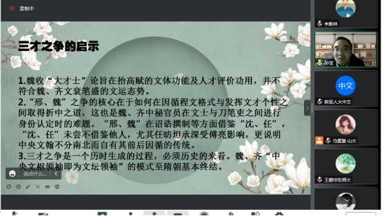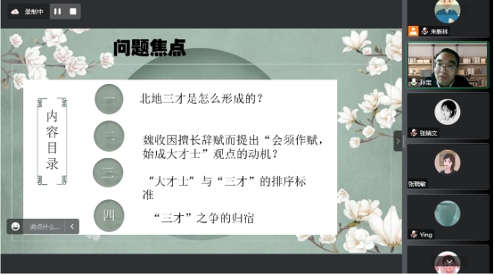孙宝老师详解了魏收“大才士”论的内涵,指出这其实体现了急于摆脱长期担任中枢文职而角色固化为“刀笔小人”“几案之吏”的焦虑,既迎合了高氏集团以辞赋润饰中兴的需要,同时也暗含魏收以辞赋之能重塑文坛格局的动机。梳理“邢魏”之争的终结后,孙老师指出“大才士”之辩、“三才”排序、魏收与阳休之之争归根结底只是汉人文官的内部矛盾。他聚焦齐末胡汉党争与文林馆的中央文枢化,揭示了文林馆从建立至解体的全过程,“武职疾文人”正是其政治动因;而文林馆的瓦解,也预示了北齐国运的完结。讲座的结尾,孙宝老师讲解了“三才”之争的归宿、历史遗产和启示,为大家构建了对“北地三才”的完整认识。