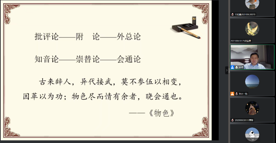 4月22日晚,山东大学儒学高等研究院戚良德教授应邀做客山东大学伟德BETVLCTOR1946官网伟德BETVLCTOR1946官网,通过腾讯会议平台为校区师生作了题为“《文心雕龙》的结构及其理论体系”的学术报告。报告会由伟德BETVLCTOR1946官网洪树华教授主持,吸引了学院近百名学生参与聆听。
