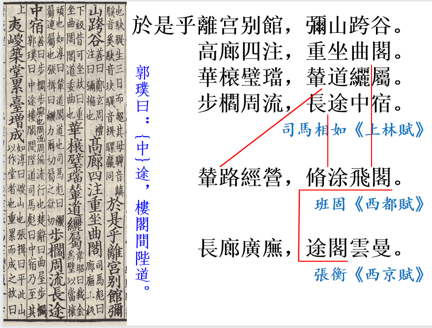 在此基础上,金老师列举了五条典型《选》文材料,分别说明解读《文选》的基本方法。首先以班固《西都赋》“表以太华终南之山”李善注“表,揭也”,引出扬雄《羽猎赋》“揭以崇山”,张衡《东京赋》“大室作镇,揭以熊耳”等相关文献,进而从词义和语境两方面说明“乱北渚兮揭南涯”李善注“揭,高举也”是揭裳涉水之意,进一步揭示了李善注的注释作用。同时指出,要注意运用音韵材料揭示李善注在释义时的同中之异。其次,结合张衡《西京赋》“途阁云曼”之“途阁”,或作“连阁”,或作“延阁”,上溯班固《西都赋》、司马相如《上林赋》,指出综合排比利用相关文献的重要性,李善注和五臣注具有相互参证的作用。最后,金老师以左思《三都赋序》“而论者莫不诋讦其研精,作者大底举为宪章”为例,指出注音材料同样具有提示异文的重要性。他通过对比李善注、五臣注、陆善经注,说明三家注与原义均有抵牾之处;又以《音决》“许,如字;或为讦,居碣反者,非也”所提供的的异文材料为突破口,梳理出“诋讦”应是由于“许”与“讦”字形相近,后又因传抄讹误,衍“诋”字而成。金老师综合各种方法,说明了注文对《文选》理解的提示作用、读注需相互印证以及如何充分利用《文选》音韵材料阅读文献等几个方面的问题。