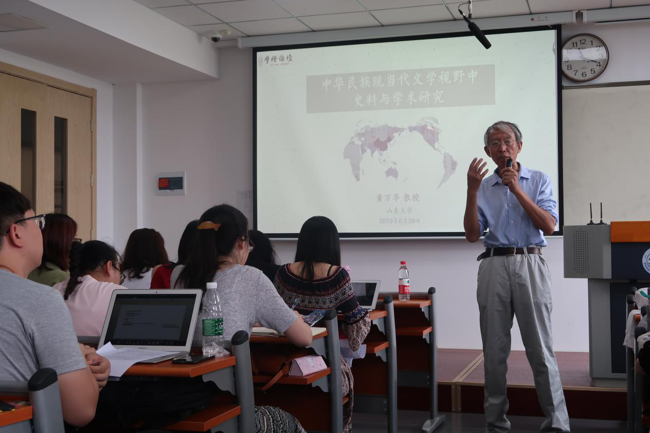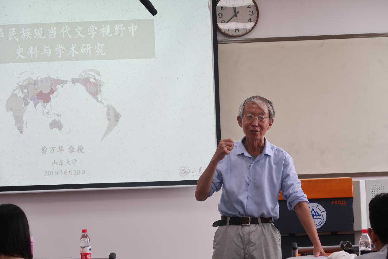 本站讯 2019年6月28日上午10时10分,由学灯论坛组委会主办,伟德BETVLCTOR1946官网承办的博士生高端论坛“中华民族现当代文学视野中的史料与学术研究”在电子楼404室举办。本次讲座主讲人为中国世界华文文学学会副会长、山东大学文学院二级教授、山东大学伟德BETVLCTOR1946官网常青树特聘教授黄万华。山东大学伟德BETVLCTOR1946官网杨慧教授主持讲座,四川大学文学与新闻学院姜飞老师,辽宁大学文学院胡哲老师,山东大学伟德BETVLCTOR1946官网王艳丽老师、唐鹏举老师、于京一老师、芮欣老师参加了此次活动。