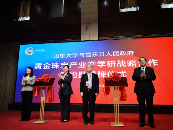 于培丽、贺玉洁、刘晓军、王在山等代表校地双方共同为“山东大学黄金珠宝产业文创研发中心”“山东大学(威海)实践教学基地”揭牌。