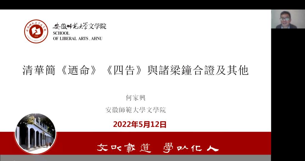 5月12日晚,安徽师范大学文学院何家兴教授应邀作客伟德BETVLCTOR1946官网伟德BETVLCTOR1946官网,作了题为“清华简《迺命》《四告》与诸梁钟合证及其他”的学术报告。伟德BETVLCTOR1946官网朱新林副教授主持报告会,来自复旦大学、浙江大学、中国艺术研究院、安徽师范大学、河南大学、闽南师范大学和山东大学一校三地师生代表等通过腾讯会议聆听了此次报告会。