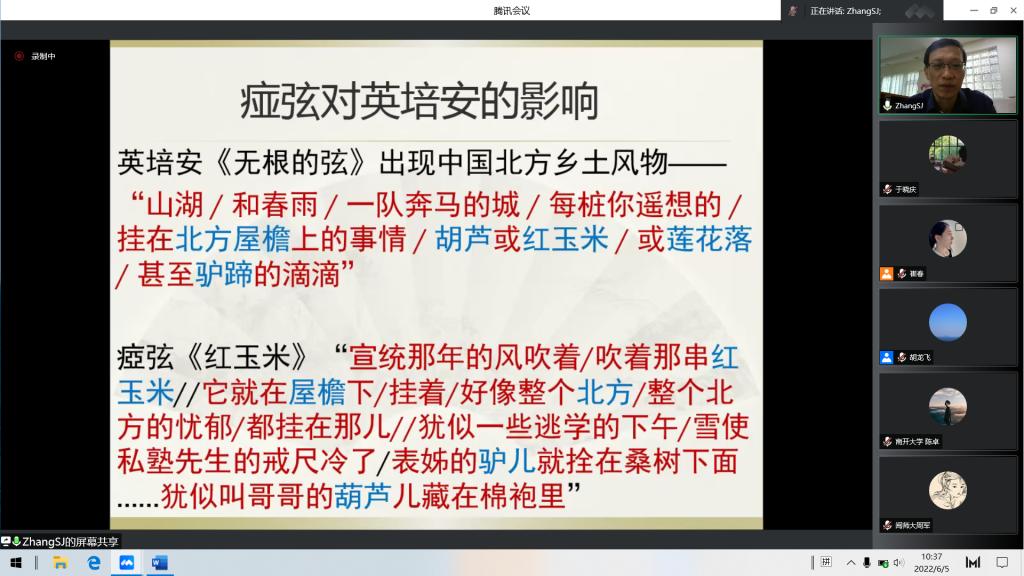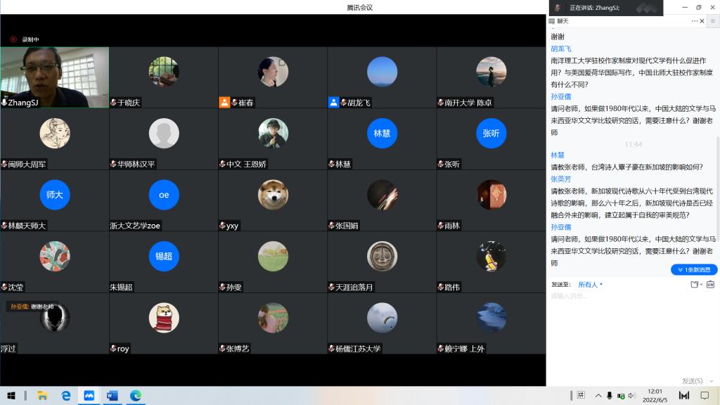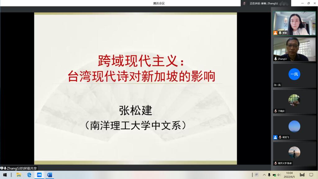 6月5日上午,南洋理工大学人文学院张松建副教授应邀做客伟德BETVLCTOR1946官网伟德BETVLCTOR1946官网,主讲题为“跨域现代主义:台湾现代诗对新加坡的影响”的学术报告。伟德BETVLCTOR1946官网崔春副教授主持报告会,来自浙江大学、南开大学和山东大学一校三地等高校的近百名师生通过腾讯会议共同聆听此次报告。