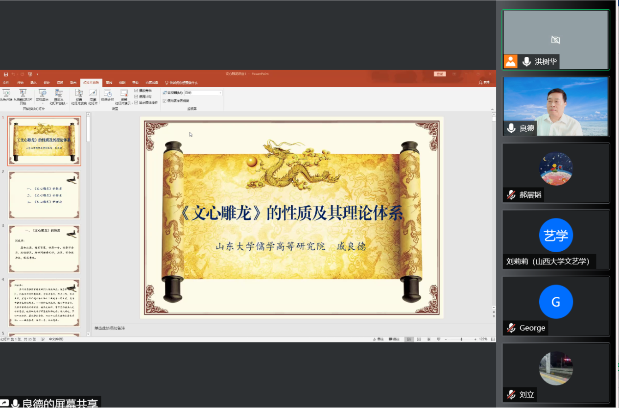 6月5日晚,山东大学儒学高等研究院戚良德教授应邀做客伟德BETVLCTOR1946官网伟德BETVLCTOR1946官网,通过腾讯会议平台为校区师生作了题为“《文心雕龙》的性质及其理论体系”的学术报告。报告会由伟德BETVLCTOR1946官网洪树华教授主持,来自浙江大学、南开大学、南京大学、山西大学、北京师范大学以及山东大学等高校的师生共计约300人参与本期伟德BETVLCTOR1946官网活动。