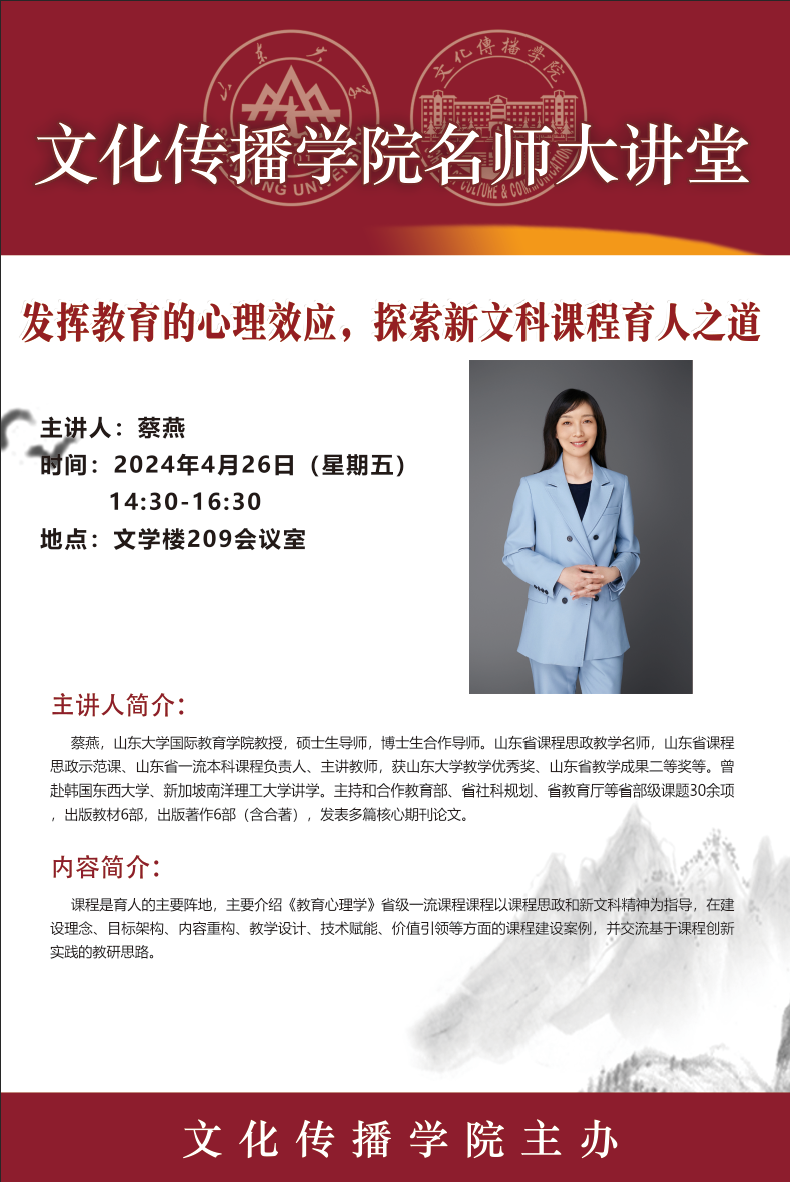 蔡燕,山东大学国际教育学院教授,硕士生导师,博士生合作导师。山东省课程思政教学名师,山东省课程思政示范课、山东省一流本科课程负责人、主讲教师,获山东大学教学优秀奖、山东省教学成果二等奖等。曾赴韩国东西大学、新加坡南洋理工大学讲学。主持和合作教育部、省社科规划、省教育厅等省部级课题30余项,出版教材6部,出版著作6部(含合著),发表多篇核心期刊论文。