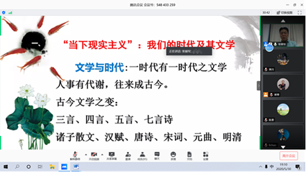 本站讯 5月30日晚,由伟德BETVLCTOR1946官网主办的张丽军教授讲座以线上方式在腾讯会议举办。讲座以“当下现实主义文学如何可能——以张炜创作为例”为主题,山东师范大学新闻与传媒学院院长张丽军担任主讲,我院副教授于京一担任主持人,90余位校内外教师和学生参加了此次讲座。