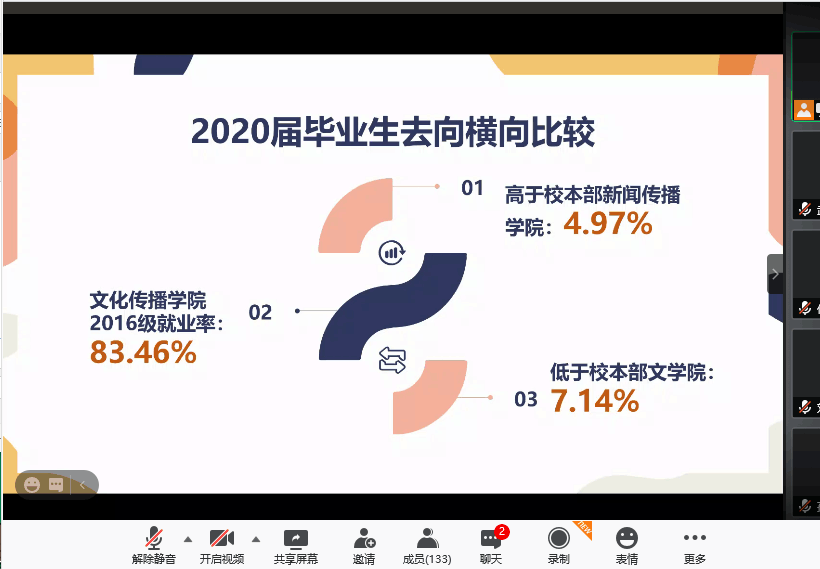 本次会议主要分为“我们的大三”、“问题困扰”和“应对措施”三个板块。会议伊始,李丁以习近平总书记对当代大学生的寄语引入,指出时代对学生的召唤。李丁介绍了今年山东大学毕业总人数和去向落实率,还向学生展示了伟德BETVLCTOR1946官网与文学院、新闻传播学院就业率的横向比较,指出学院就业率之间存在差别。详细的数据分析让同学们对毕业就业率有了初步了解。李丁通过班委提前了解收集了各班总体情况和就业意向。2018级汉语言1班荣获优良学风班集体,在学院及学校班集体答辩中取得了优异成绩。2018级汉语言2班获得先进班集体称号,班委工作成绩突出。汉语言文学专业大部分同学具有考研意向,考公与求职也各占一定比例。汉语国际教育班级在在文体活动方面具有特色,并且在英语类竞赛中有所成就,选择考研比例偏高。2018级新闻1班在学术科研方面成绩优秀,学风优良。2018级新闻2班同学具有榜样示范作用,在大学生广告艺术大赛取得优秀成绩。新闻专业相比于其他两个专业,求职意愿率更高。李丁总结道:“每个班级都在各自擅长的领域探索进步,祝贺大家取得的成绩。”