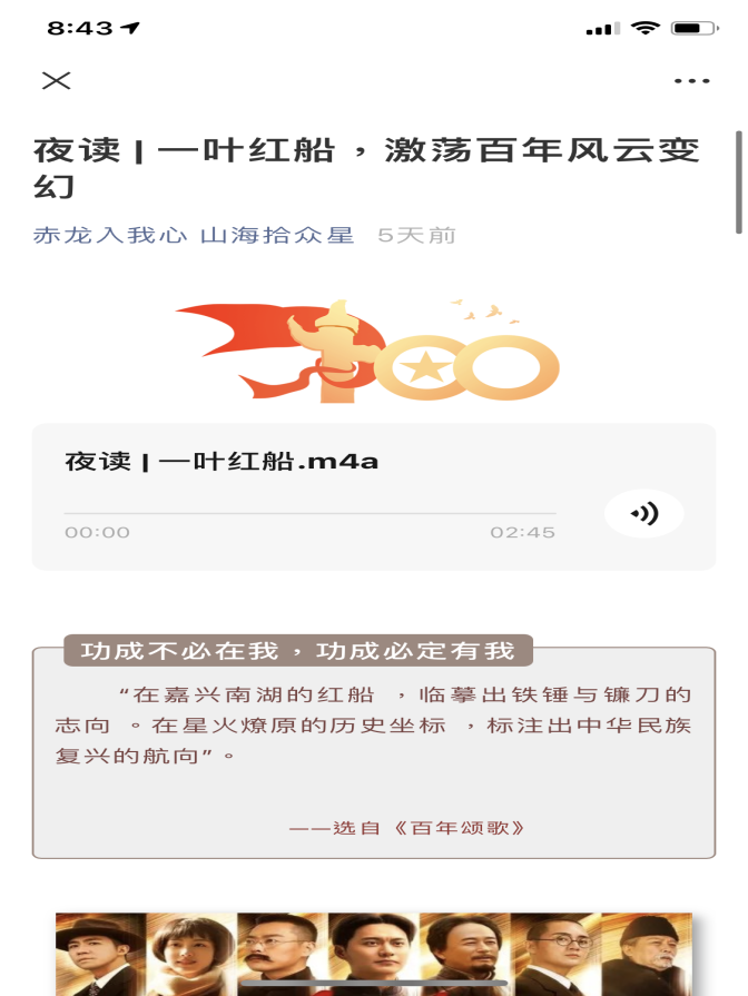 本团队以“赤龙入我心,山海拾众星”为名创建公众号,前后共推出党史日签板块、党史夜读板块、《习近平讲故事》研读板块、经典历史故事重讲板块、历史风云——自制短视频板块等独具特色、富有创新性的内容,累计发送推送共20余篇。其中的党史夜读板块由团队成员讲述党史故事,推送开篇可见成员朗读的语音条,此举旨在为无时间阅读整篇文章的人群提供语音收听的便利服务,同时帮助团队成员更好的理解文章内容,将党史知识真正内化于心。