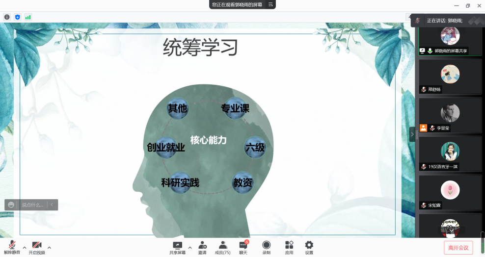 仵迪同学在谈到自身学习经验时提出了“三个要”,即老师上课要有效听,课堂笔记要有效记,复习计划要切实做。她指出,对于不同的老师的课堂,要运用不同的听课方法。在 “高密度输出类型”课堂,需要边听边思考边做笔记;在“讲座型”的课堂,要学会分辨学术趣事与重点知识间的分界,记录后续的总结和重点。