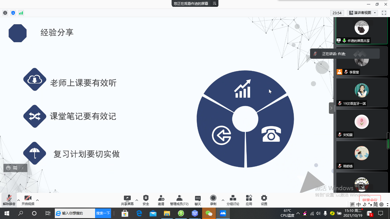 本次支部学习经验分享会由2019级汉语言一班团支委主办,意在发挥身边“榜样的力量”,帮助同学们解答学习生活中的困惑。在学海同舟共济,支部成员互相学习,共同进步,携手拥抱更优秀的自己。