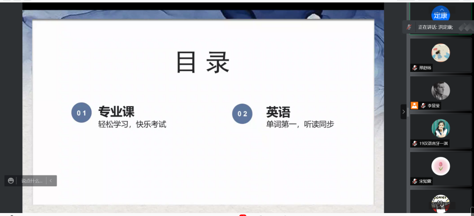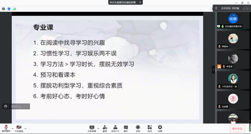 洪定康同学的经验分享则分为了专业课和英语学习两大板块。专业课部分,他强调要在阅读中找寻学习的兴趣,让学习娱乐两不误。在他看来,我们应当着力摆脱功利型学习,重视自身综合素质的培养。