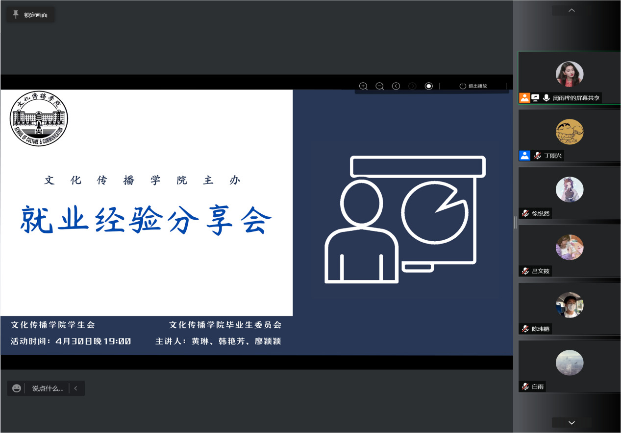 本站讯 4月30日晚,由伟德BETVLCTOR1946官网学生会、毕业生委员会联合主办的“就业经验分享会”第一期通过腾讯会议平台于线上开展。分享会面向学院全体学生。优秀学生代表2018级新闻专业韩艳芳,2018级汉语言文学专业廖颖颖、黄琳应邀担任会议主讲人,学院学生会综合事务部成员周雨桦担任主持人。